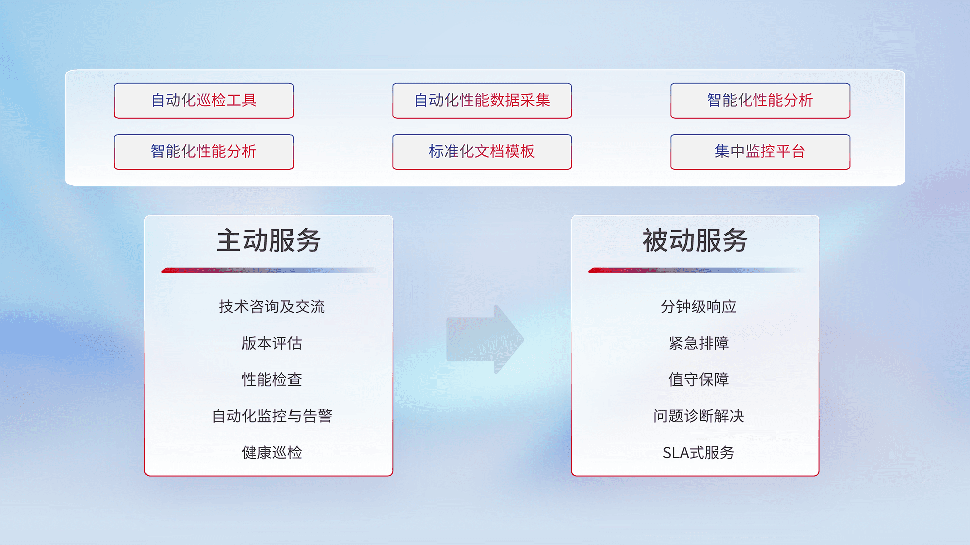 智能化工具和标准化文档,,保障服务质量,,提供主动服务(包含技术咨询、、版本评估、、性能检查、、、自动化监控与告警、、、健康巡检)和被动服务包含(分钟级响应、、紧急排障、、、值守保障、、、、问题诊断解决、、、SLA服务)。。